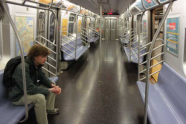 | Subway tog holder ved perron ved World Trade Center. Der er usædvanlig meget plads og ro, det er da også endestationen for ekspress rute E, der kører til et sted i nærheden af JFK-lufthavnen i Queens. Med express menes, at toget springer stationer over undervejs, i denne udgave betyder det, at der er fire spor det meste af vejen, hvor de midterste er forbehold express-togene, mens de yderste for lokaltogene. Ved knudepunkter mødes togene på ø-perroner, og ofte afventer to tog hinandens passagerer, for at få systemet til at køre helt velsmurt. |