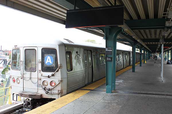 | Et A tog, som også er en express rute, ligeledes ved en endestation. Linjen ender meget langt udenfor byen, nemlig ved Atlanterhavet i Far Rackaway. Det koster det samme at køre helt herud, som det koster at køre en kort tur mellem to stationer. 2½ dollar på et metro-kort. |