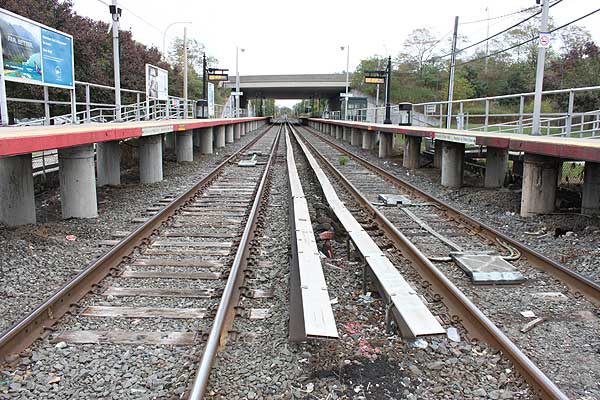 | Højbane på J-ruten i det fattigste New York i Queens. Stationen er 111. Street. Bemærk det tredje spor som benyttes af gennemkørende Z-tog i myldretiderne, hhv. ind mod byen og ud af byen. Bemærk også strømskinnerne, som leverer 625 volt jævnstrøm til slæbesko på begge sider af togene. Denne såkaldte tredje skinne betyder, som ved andre metrosystemer, at tunnelerne ikke skal graves så store. Havde man brugt overledning til at hente strøm, ville det have krævet højere tunneler end absolut påkrævet. |