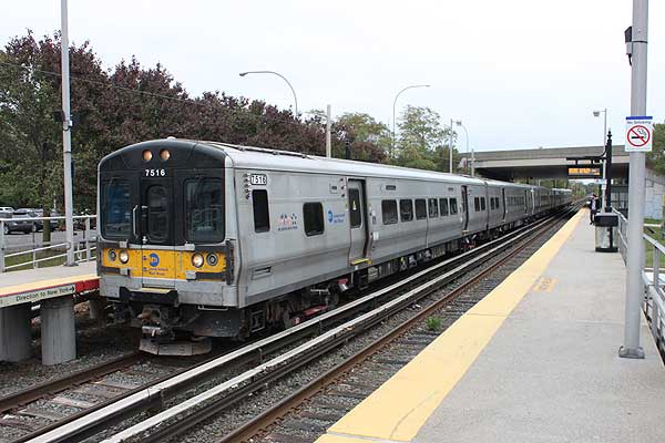 | Udefra ligner forstadstogene lidt subway togene. Men der er masser af siddeplads indendørs og man bliver billetteret af personalet. Hér ankommer et tog til Far Rockaway til stationen Inwood på en sidebane, hvis tog starter fra Loing Island Railroads store terminal Jamaica. Togsættet hedder M7, og er leveret fra 2002 og til idag. Der er enormt mange af dem. |