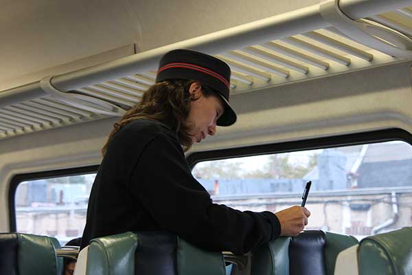 | Konduktøren er meget venlig og imødekommende. Man føler som passager, at man er vigtig og behandles godt. Her skrives der på en billet, så den rejsende kan komme videre trods en fejl i billetten. |
