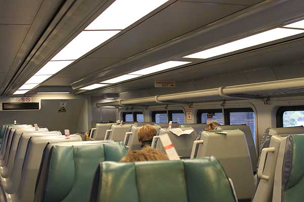 | M2 sættene er mere "amerikanske", fx er stolene arrangeret ret pussigt, så det midterste sæde har lidt lavere hovedstøtte end de andre (som den unge dame med de runde øre-ringe sidder i). Dette tog var i næste togsæt forsynet med bar, så man kunne købe sin kolde Coca Cola. |