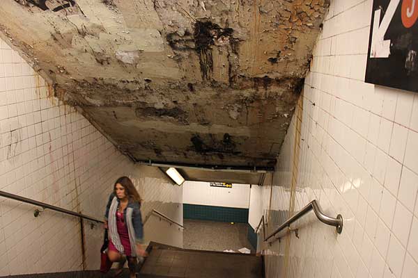 | Mens togene faktisk er pæne og nye, så bærer skinner og stationer vidnesbyrd om lang tids mis-vedligeholdelse. Her er der mug og rust i en gennemgang i tunnelbanen. |