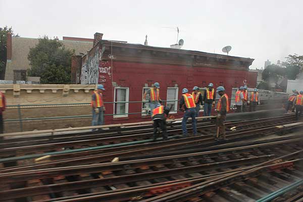 | Heldigvis er der reparationsarbejder igang, både på stationer, og som vi ser her på J- og Z-linjen med at reparere skinnerne. Det virker ikke enormt effektivt, og man er da også begyndt at spærre linje-stykker nogle aftener, så der skan sættes tungt materiel igang. >> Se meget mere om New Yorks subway på Wikipedia Long Island Rail Road |