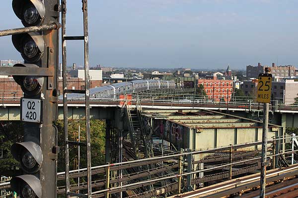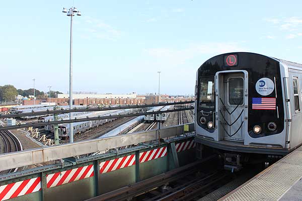 | Et L-tog holder på Broadway Junction og sætter passagerer af, før det fortsætter mod Manhattans 14th. Street. Netop denne subway station udmærker sig ved at have en enormt net af højbaner, sammenflettet med et depot, der i de stille dagtimer gemmer en masse togsæt til myldretidstogene på linje Z. |