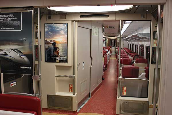 | De nye M8-tog er meget nydelige, fx med handicap-afdeling og dertil hørende toilet. Bemærk reklamen fra tog-fabrikanten Bombardier i forgrunden til venstre. Toget er leveret ikke af Bombardier, men af japanske Kawasaki Heavy Industries, og de ligner da også nye japanske tog. |