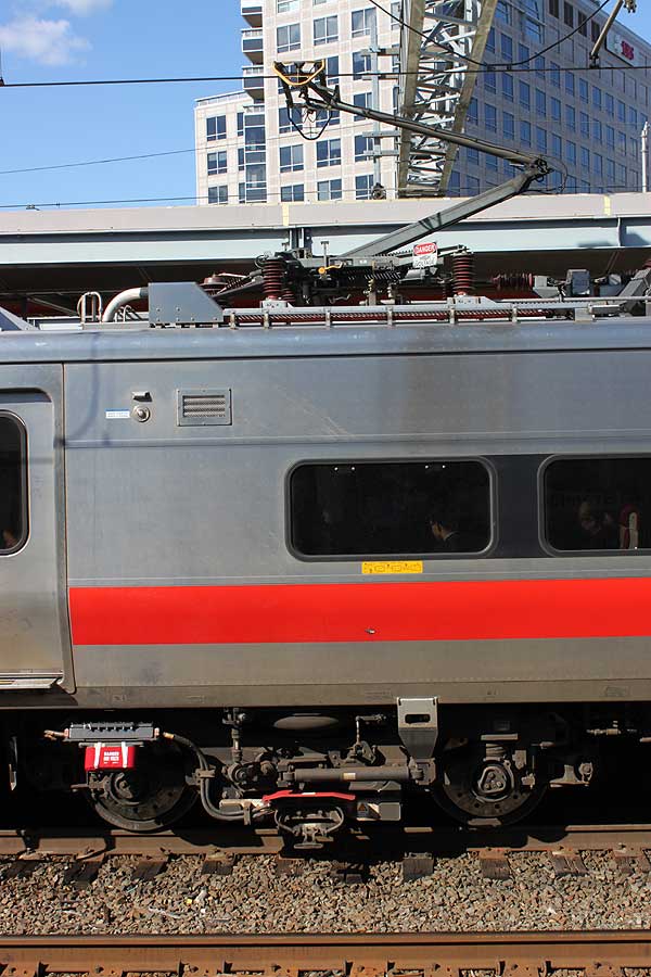 | Et tilsvarende tog passerer over klap-broen over Mianus River, hvor floden udløber i Long Island Sound (Atlanterhavet). Mellem de to rustrøde gitterportaler ophører overledningen! Sidste del løfter køretråden, så pantograferne er strukket helt ud og slipper tråden - mens toget triller gennem de 30 meter uden strøm. Og så kommer pantografen igen i kontakt med en køretråd. Der er hastighedsnedsætning over broen. I øvrigt et fantastisk sted at fotografere: Stå af ved Cos Cob og gå frem i terrænet. |