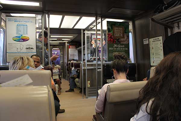 | Fra øverste etage i dobbeltdækkertoget. Bemærk billetterne, der hænger over stoleryggene. I USA hedder det, at man skal foretage "Ticket collection". Det er helt bogstaveligt ment, for personalet sætter ens billet op, hvis det er i starten af ruten, eller de samles simpelthen ind. Skal man skifte med samme billet, så forsynes sædet med en midlertidig billet, som kontrolløren laver. Så kan der holdes øje med, hvem, der er blevet kontrolleret. Flytter man plads, skal man tage sin billet med. >> Læs meget mere om Long Island Rail Road på Wikipedia Metro North - New Haven Railroad |