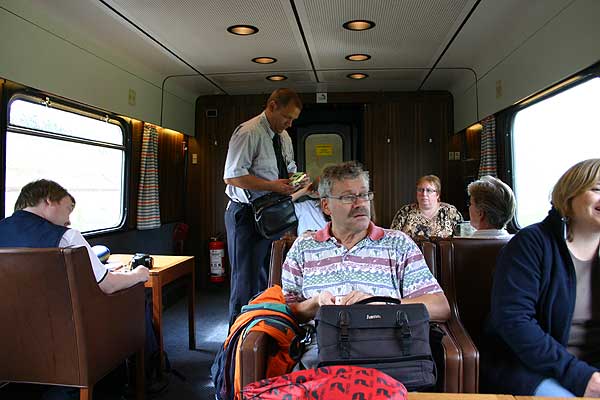 ![]() Inventaret og komforten i storrumskupeen på 1. klasse lader ikke moderne tog noget efter. |