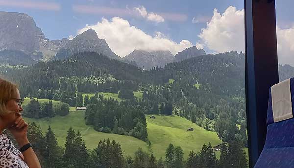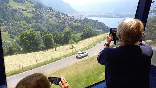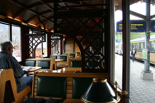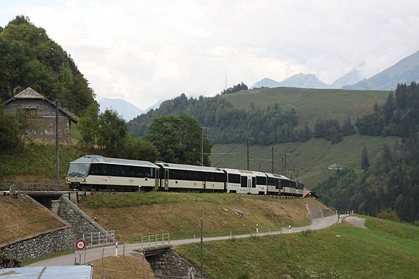 | Nu et foto fra de fine tog, der i dag (2025) dominerer de gennemkørende tog Interlaken Ost - Montreux. Det er dem, der kan justere sporvidde og højde af vognkassen. Jo, der er også ganske god udsigt fra 2. klasses panoramavogne, hvor der også kommer servering - efter at forudbestillingerne er håndteret. |