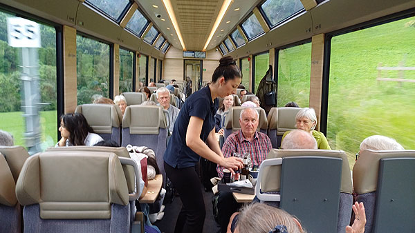 | Styrevognen er ikke bare 1. klasse, men VIP-klasse. Udover sæderækkerne i spidsen under lokomotivføreren så er 1. klasses vognene som vi kender dem fra andre smalsporstog i Schweiz. |