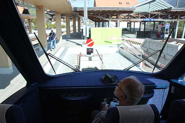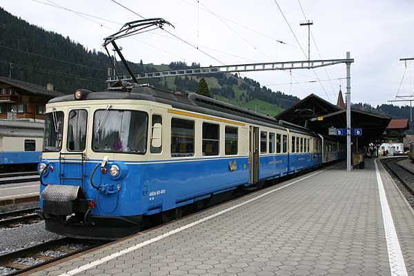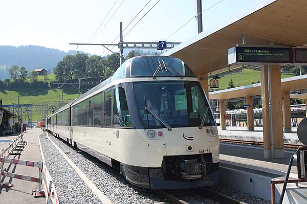 | Styrevognen med VIP-klasse bagerst i et tog klar til afgang fra Zweisimmen. Disse tog kører ikke længere end Zweisimmen, da de ikke kan skifte sporvidde. |