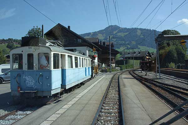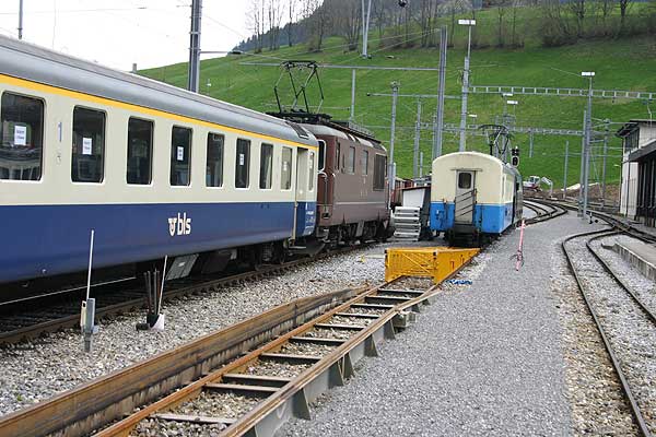 | I Zweisimmen slutter smalsporet og herfra er det videre med BLS til Spiez ved Thunersee. Midt i billedet det klassiske brune BLS standardlokomotiv Ae 4/4 fra 50'erne med et regionaltog. Det mærkelige spor-arrangement i midten af billedet er en simpel, men effektiv rampe mellem 1000 mm smalsporet og 1435 mm normalsporet. En normalsporsvogn kan køre ind på det forhøjede spor og kan forsynes med smalspors transportører og dermed rulle ind på smalsporsområdet, hvis den mobile, gule rampe lige flyttes til side. Skubber man til gengæld en smalsporsvogn op på den gule rampe, så er der pludselig adgang til ladet på en normalsporet fladvogn. I Zweisimmen kan MOB få materiel ind og ud fra sit spornet, der i øvrigt ikke er i 1000 mm forbindelse med de mange andre schweiziske smalspors net. Bemærk undervejs at vognen løftes op, så bogien ikke er belastet, og hjulafstanden kan justeres, inden vognen løftes ned igen.