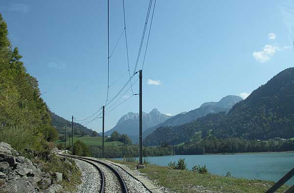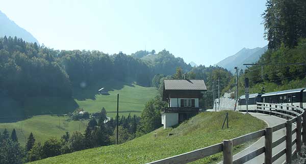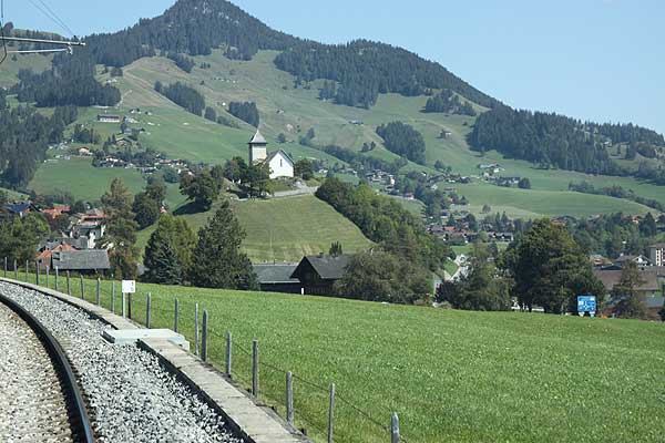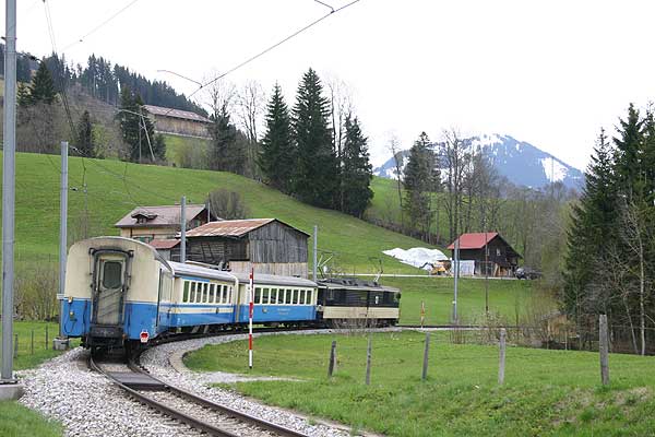 | Der er i Montbovon en sidebane til Gruyeres (kendt for osten af samme navn), og nu har MOB banen skiftet kurs op mod anden pashøjde. Foto lige før stationen Allieres. |