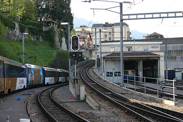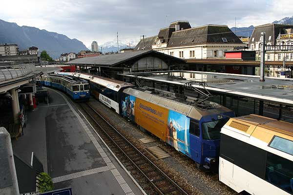 | En morgenstund på banegården i Montreux. Smalsporsbanerne fylder langt mere i billedet end de sektoren med de normalsporede tog (kun de to hovedspor Brig - Geneve). |