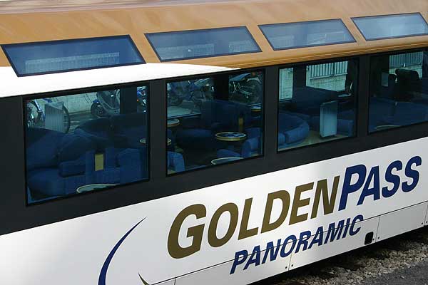 | Panoramavognene findes i to generationer, den mest "bløde" version er fra 1979 (de tre vogne til venstre i billedet) mens den mere kantede version er (til højre i billedet) er fra 2000. Vognene har været i mindst tre bemalinger, nu er farven den gyldne + hvide med GoldenPass varemærket. Denne snedige oprangering har jeg ikke set siden 2020. |