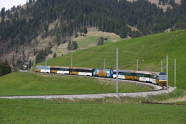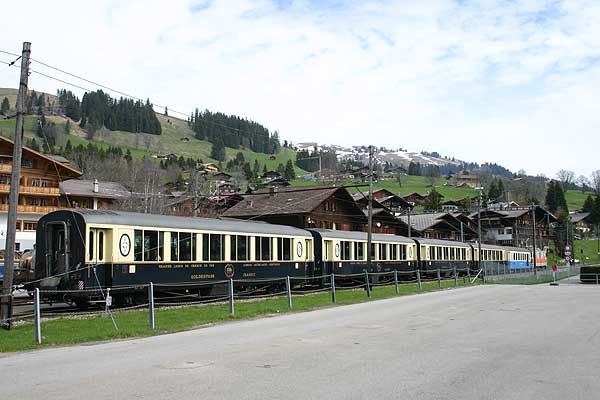 | Helt ny er denne ejendommelige togstamme. Den består af fire pullman-agtige vogne og en standardvogn (som de lokale passagerer kan opsøge). MOB kalder vognstammen for GoldenPass Classic. Foto fra Schönried station. |