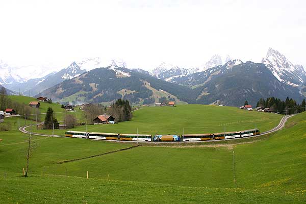 | Et lokaltog udstyret med almindelige passagervogne og med en GDe 4/4 fra 1983 som trækkraft på vej nedad bakke til Gstaad. |