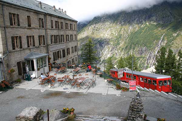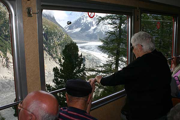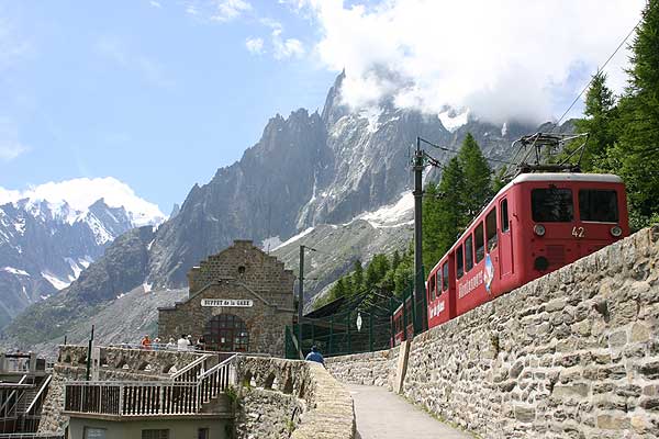Fra Chamonix kan man med tandhjulsbane komme op og kigge på alpernes næst-største gletcher Mer de Glace, i al fald på den nedre del. Da banen blev bygget for 100 år siden var en del mere imponerende end gletcheren er nu. Men uanset hvad, så er det en flot tur. |