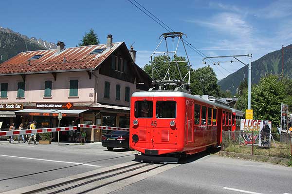 | Banegården i Chamonix (1042 m.o.h.) er flot og pompøs. Adgang hertil via gangbro over Mont Blanc Express' banelegeme. |