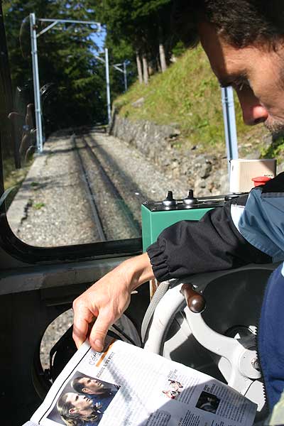 | Toget er to-mands betjent. I styrevognen kan assistenten ikke trykke på gaspedalen, men skal på vej op holde øje med strækningen, tude med hornet og kan tale med lokomotivføreren. På vej ned er der ikke noget at lave, så et illustreret magasin med fodboldstof om helten Zedane falder lige tilpas. |