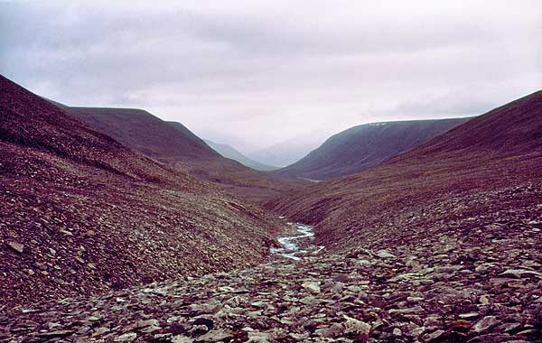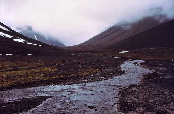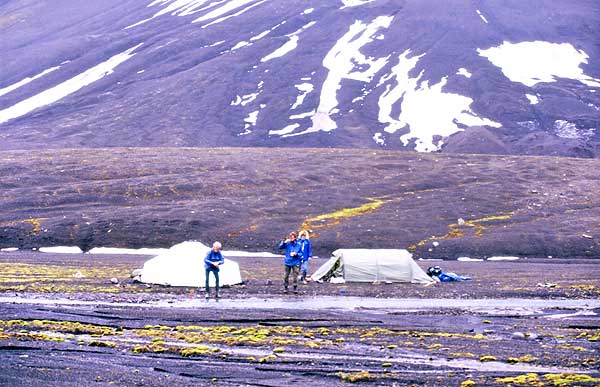 | Man synes at kunne spore en vis rejsetræthed eller snarere et ønske om at komme til Longyearbyen og blive vasket. Undertegnede har selv svært ved at mobilisere entusiasme mere, og går i egne tanker og forbereder at komme hjem til alt det, der ligger og venter på at blive gjort. Tiden er gået fantastisk hurtigt, samtidig med at jeg synes vi har været længe af sted ud på det vi har oplevet. Nå, vi fik pakket (det går hurtigt nu!) og trissede af sted i småregn og lavthængende skyer. En nem nedstigning til Adventdalen var hvad vi forventede. |