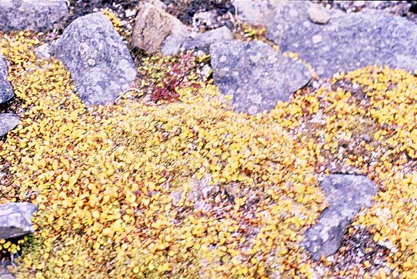 | Dværgbirk i efterårsfarver. Nu gik det videre i noget absolut væmmeligt terræn. Enten gik vi på blokmark eller også i våde tuer. Stemningen var noget mat og faldt i takt med at regnen stadig tog til. Endelig nåede vi Adventdalen, hvor der dukkede en masse hytter op, både nye og gamle. |