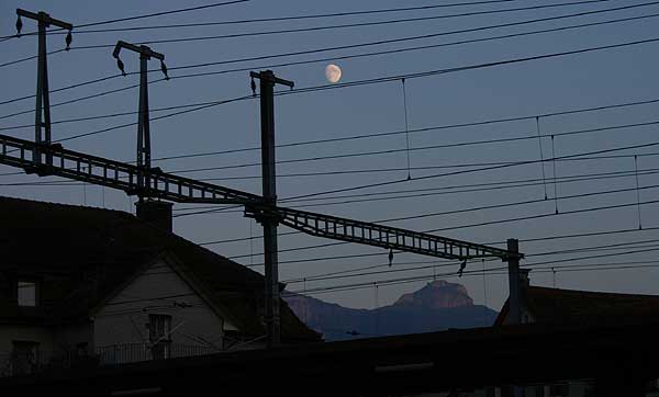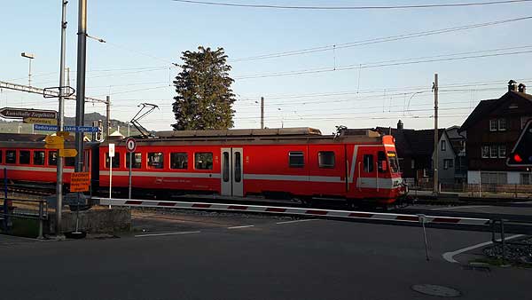 | Første morgensol på tog, der ankommer til Appenzell. |
