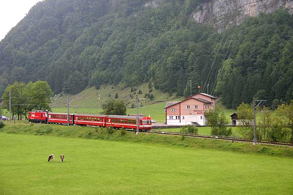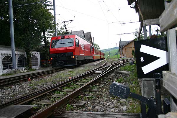 Tog i modsat retning i den skarpe kurve ved indkørslen til Urnäsch lige før floden af samme navn. 19.9. |