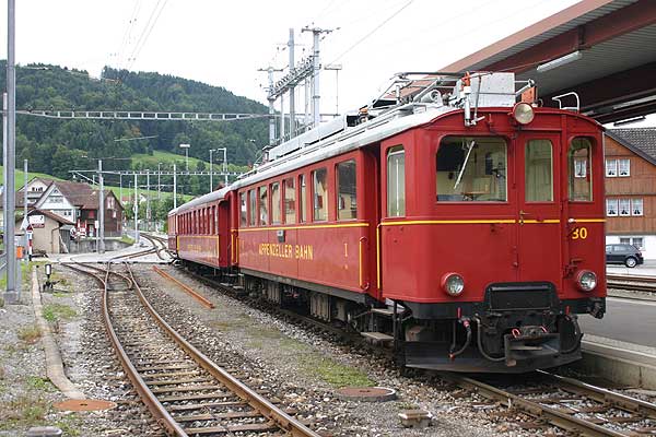 Hovedstrækningen på nettet på 32 km. På denne gren af nettet kommer Stadler togsættene til at dominere, endnu i 2018 kørte de ældre togsæt. Farverne er de rød-hvide. Fire togsæt håndterer trafikken, mens der er et sæt i reserve. De ældre togsæt består et tog af en motorvogn, to mellemvogne og en styrevogn. De nye Stadler togsæt fra 2018 er nogenlunde af samme størrelse. Der kan køre ekstra materiel med, hvis der forventes mange passagerer. Der kan påsættes ekstra mellemvogn og motorvogn i A-enden (dvs. mod Wasserauen), men ét af sættene får bare en mellemvogn og styrevogn på. Et 4-vognes sæt kombineres endog med et 3-vognes sæt, så det bliver til hele 7 vogne. Der køres med ½-times drift næsten hele dagen. Der er ikke tandhjulstræk på denne del af banerne. Banernesene lokomotiv er set parkeret i Herisau. |