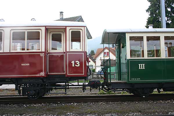 | To andre veteranvogne er også restaureret i fineste stil, fotograferet i Appenzell. Bemærk forskellen i montering af koblingsstængerne. På vognen til venstre sidder koblingsstangen inde ved akslen. På vognen til højre sidder den direkte på vognrammen. Alt materiel er forsynet med moderne centralkoblinger. |