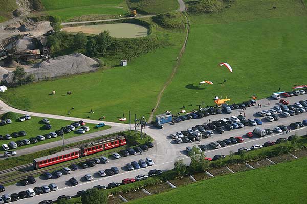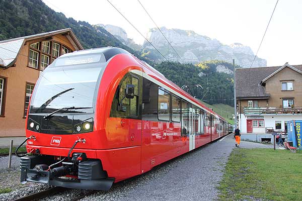 | Ekstra vogne står klar ved endestationen Wasserauen, så togene kan forlænges, når behovet opstår i weekender, feriedage og på dage med særligt godt vejr. Et par paraglidere lander lige bag stationen. I 2018 står der herude i enden veterantog, idet opformering af vogne ikke længere foregår i Wasserauen. Det var ved banens oprettelse tanken at der skulle skiftes tog hér, og fortsættes med dels en regulær bjergbane med tandhjul og en funicular mod bjerget Säntis (2.502 m.o.h.) via den pragtfulde Seealpsee. Det kneb imidlertid med finansieringen. Det endte med en svævebane fra vestsiden, med adgang fra Urnäsch, bus til dalstationen, og så med svævebane. |