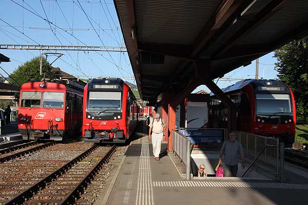| En af veteranerne fra el-togsdrift på banen "Drissgi" med to samtidige passagervogne ved spor 4B i Appenzell. Det er så snedigt, at plantoget i spor 4A kan klemme sig udenom veterantoget ved at benytte sporet til venstre i billedet. |