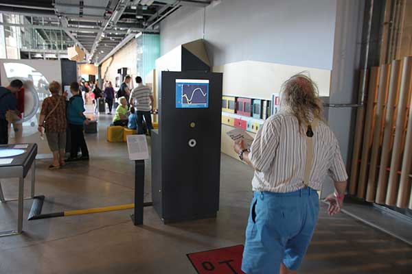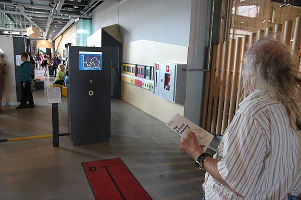 | Foucault pendul i Science Centrets forhal. Væltede en pind ned på en klokke hvert kvarter. Pæn udgave! Serviceområde med forskellige kasser (forvirrende) i baggrunden, kø-område på den anden side. Butik og café til venstre, karrusel-sluser med rfid-adgang både til butik og til øvrig forhal. Men der var mandskab, der hjalp gæsterne, og hersede lidt rundt med os. Jeg viser nu et udvalg af de opstillinger, jeg synes fungerede rigtig godt. Desværre var der også mange ting, som tydeligvis ikke virkede godt, men det vil jeg lade ligge. Slid og vedligeholdelse spiller ind. |