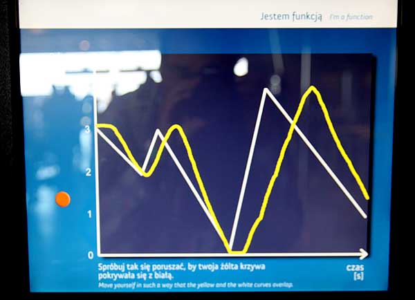 | Jeg er en funktion. Herlig opstilling med tæppe som målebånd 0 - 4 meter. Tryk start og du får lov til at prøve at se din afstand blive målt som en funktion af tiden. Dernæst bliver du opfordret til at prøve at tegne en given funktion ved at trykke igen (der er nogle stykker, der vælges imellem). Det er svært og sjovt. Min ledsager prøver hér at gøre funktionen efter. |