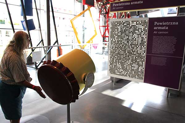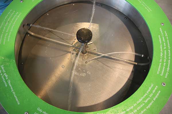 | Koriolis springvandet En opstilling vi også havde i det gamle vandafsnit. Hér godt og robust udført. Når man drejer på knappen i midten ser man hvordan de fire vandstråler afbøjes. Meget udmærket. Vores i sin tid drejede selv lidt rundt (fordi der var en dyse, der pressede vand ud, så der kom lidt fremdrift). Måske er denne version i Warszawa bedre, fordi man er udmærket klar over, at man skal dreje på knappen og ikke bare skal kigge på. |