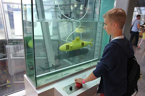 | Opdrift: Få ubåden til at synke og stige og evt. bare hænge i midten af vandsøjlen En klassisk leg forsynet med to trykkamre, der er synlige, for og bag på ubåden. Og røde pumper og sorte vintiler, hvis betjening får ubåden til at stige og synke. |