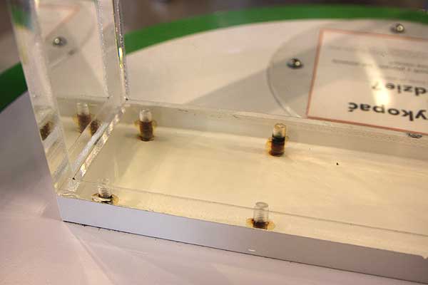 | Man kan på billedet se, at der er to små elektroder, der kan kortsluttes, når der er nok kviksølv på målet. Tilmed må der også have været en svag magnet eller lignende, der holdt kviksølvet lidt på plads på begge målområder. Meget underholdende, gav mange strategiske overvejelser, flotte former og de helt rigtige tanker om egenskaber ved materialer. Bravo! |