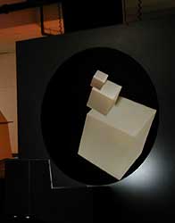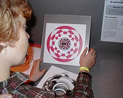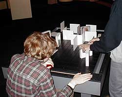| Spejllabyrint 5 lidt tykke spejle og en masse hvide "rumdeler"-plader. Et foto sættes op. Lav nu en sjov og indviklet labyrint, så du stadig ser på foto'et nede fra enden af bordet, set nede fra bordplanet for enden af. Spejle og foto kan stå selv, rumdelerne sidder fast i revnerne i bordet. Du har en spottet lampe til din rådighed til at tune spejlgangen, det er dén Simon holder i sin venstre hånd. Drengene var meget optaget af denne opstilling. |