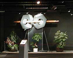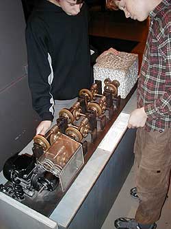 Vrid granitblokken / nedgearing En motor kører jævnt (ses til venstre). Første tandhjul snurrer lystigt, andet tandhjul kan man lige akkurat se bevæge sig lidt. Og så ser man faktisk ikke mere bevæge sig. Men henne i enden sidder det sidste tandhjul i to punkter boltet ind i klippen. Forbavsende at omdrejningerne (dvs. energien) kan forsvinde i de mange gear! En klassiker, men var meget pænt udført, og det er altså helt filosofisk at omdregningerne sådan bliver væk for øjnene af en. Teksten forklarer selvfølgelig nedgearingen omhyggeligt. |