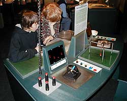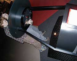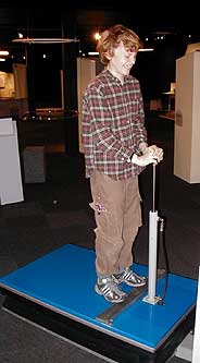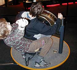 Rodeogyro Et flot eksempel på en "tivoliseret" science opstilling. Det store gyrohjul (på tværs foran Victor) er elektrisk drevet, når man med sit tyngdepunkt tvinger gyroen ud af kurs, får man en snurretur, så man virkelig har lyst til at svinge armen bagud og råbe "yahooo" (som Simon faktisk gør). Man kan lege med opstillingen på flere forskellige måder. |