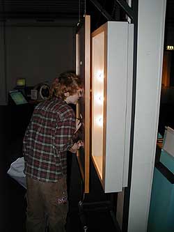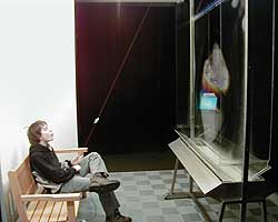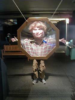 | To fokus-spejl (dual mirror) Bemærk de to røde pletter på gulvet. Står man som Simon, så ser han kun sig selv. Når jeg til gengæld står ved siden af ham ... |