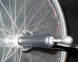 Det ene håndtag er forsynet med en kugle. Så kan det sættes op på stangen. Bemærk den pæne udførelse, bl.a. med farvet snor ude ved fælgen. |