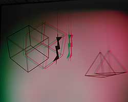 | Vandrette bevægelser bliver til roterende bevægelser (som vores "Drejer det rundt?", dvs. den med det grå filter for det ene øje) Det sjove er udvidelsen med mobilens skygger til højre. Skyggerne er jo meget to-dimensionelle på den hvide væg, men igennem filterbrillen bliver skyggerne flot tredimensionelle. |