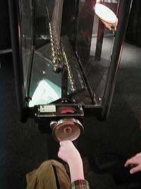Føl du er på elevatortur Tag fat om knobben, luk øjnene. Tryk på fodpedalen og oplev hvad der sker. Enten kører du op eller ned, men oplevelsen gøres meget kraftigere ved at den lille bevægelse i gulvpladen suppleres af en bevægelse af knobben (modsat). Meget interessant, syntes jeg, drengene var mere forbeholdne... |