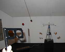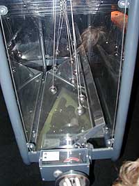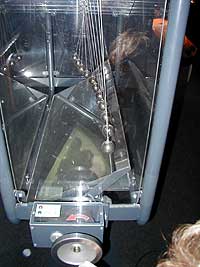 | Stålkugler i snor med forskellig svingningslængde En variat af de klassiske lige-ophængte stålkugler og en variant af slinky-fjederen. De hænger med forskellig længde ophæng. Man starter med at "spænde" opstilling op med drejehjulet, der regulerer en starter-bjælke, der skubber kuglerne op til venstre - udaf tyngdepunktet, indtil bjælken smutter tilbage og frigiver kuglerne. |