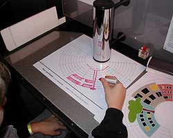 | Man kan lægge forskellige, flotte plader ind under det ophængte rør og i røret kan man så se, hvordan det skal se pænt ud. Her er drengene igang med at tegne et dannebrog flag på flagstang. |