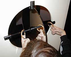 Ringe på pind, spejl i midten. Klassisk illusionsnummer. Når man kigger fra den ene side, men bevæger den skjulte ring, så virker det helt underligt og skørt. Nem at lave, en sjov virkning. |