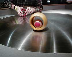 | Gyrohjul Når man har sat gang i hjulet, så kan man sætte det op på toppen af den fast monterede stang. Sæt det snurrende hjul til at dreje sig mod dets rotationsretning og så snurrer hjulet helt unaturligt rundt om pinden. Som om det svæver! |