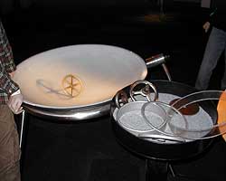 | Ryst kartoffelmelet Reguler rystelsernes frekvens - i praksis nok en dyb højtaler monteret på den nederste plade, afstanden til øverste plade var nok 3 - 5 mm. Med højeste frekvenser var pulveret i kaos, dog dukker der enkelte slanger og hvirvler op. Dæmpes frekvensen bliver mønstrene tydeligere og mere permanente. Man kan næsten nå at fryse et mønster ved at slukke omgående. Meget smuk, næsten rørende, men relationen til virkeligheden er svær at få øje på, - og teksten hjælper ikke meget. |